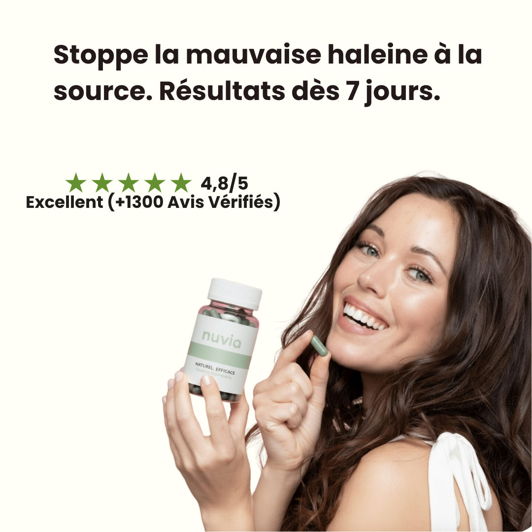 Dentifrices spéciaux, bains de bouche, sprays…J’ai dépensé une fortune pour rien. Nuvia est le premier produit qui agit vraiment à la source. Résultats rapides, haleine fraîche du matin au soir.